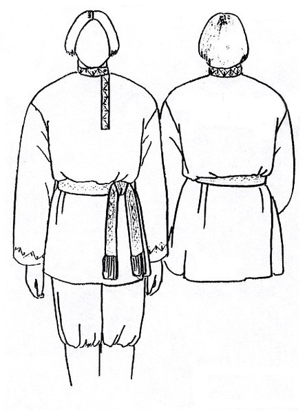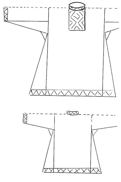 Туникообразные мужские рубахи различались многими деталями: конструкциями боковин (кошёные и прямые), рукавов (кошёные и прямые) и ворота (разрезы по середине, слева, справа, наискось, с воротом стойкой и без неё). (рис. 4,5)