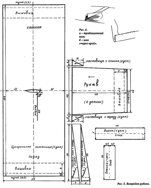1. Выкраиваем все детали рубахи, учитывая направление долевой нити и припуски на швы.