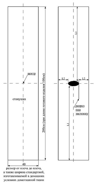 Ширина плотной шёлковой ткани, из которой сшита рубаха, — 57 см. Подоплека сшита из более тонкого шёлкового материала. Предлагаемый крой рассчитан на размер 46 при росте 160 — 165 см. Расход шёлковой ткани на рубаху с учётом припусков на швы при ширине 1м 50 см — 1 м 60 см (одна длина центрального полотнища); на подоплеку — кусок ткани размером 60х60 см.