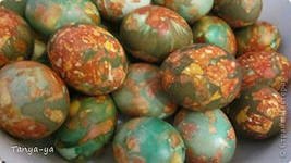 Для получения мраморного эффекта, яйца нужно обвернуть в луковую шелуху, и упаковать в хлопчатобумажный кармашек, так и варить. А можно поступить проще – добавить в кипящую воду немного растительного масла за минуту до окончания процесса варки.