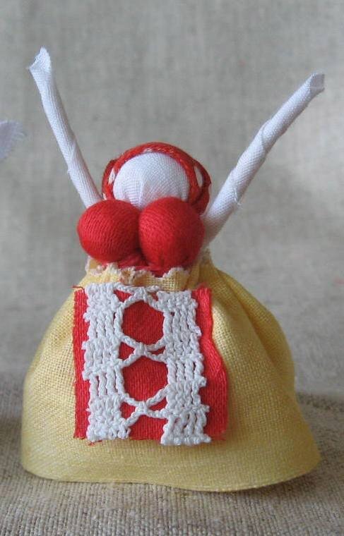 9 Последней надеваем юбку, предварительно присборенную на крепкую нитку, так как юбку надо туго затянуть. Фартук оформляем при желании разными способами.