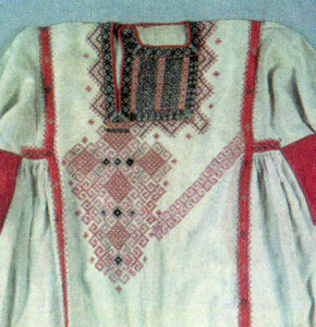 По мнению древних, следовало так или иначе «обезопасить» ee необходимые отверстия, имевшиеся в готовой одежде: ворот, подол, рукава. Оберегом здесь служила вышивка, содержавшая всевозможные священные изображения и магические символы. Языческий смысл народных вышивок очень хорошо прослеживается с древнейших образцов до вполне современных работ, недаром учёные считают вышивку важным источником в изучении древней религии. Эта тема поистине необъятна, ей посвящено огромное количество научных трудов Славянские рубахи не имели отложных воротников. Иногда удаётся восстановить нечто похожее на современную «стоечку». Чаще всего разрез у ворота делали прямым — посередине груди, но бывал и косой, справа или слева.