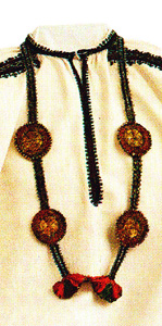 Легко догадаться, что ворот был особенно «магически важной» деталью одежды - ведь именно через него в случае смерти вылетала душа. Желая по возможности этому помешать, ворот столь обильно оснащали охранительной вышивкой (иногда содержавшей - конечно, у тех, кто был в состоянии себе это позволить, - золотое шитьё, жемчуг и драгоценные камни), что со временем он превратился в отдельную «наплечную» часть одежды - «ожерелье» («то, что носят вокруг горла») или «оплечье». Его пришивали, пристёгивали или вовсе надевали отдельно. В разделе Украшения подробнее рассказано об охранительном смысле украшений и о том, почему при маломальском достатке люди старались обзавестись золотом и благородными камнями и не прятали их в сундук, а размещали на одежде и на собственном теле.