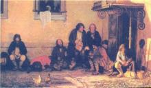 Привольное, братцы, житье было на Руси, когда не было на ней ни господ, ни попов, ни купцов толстопузых. Да только не долго так было, сказывают старики, потому увидел чёрт, что одолевает его мужик: нет на земле ни обмана, ни воровства, ни грабительства, потому всем привольно живется,— и стал чёрт думать крепкую думу, как бы ему испортить род человеческий. Семь лет думал чёрт, не ел, не пил, не спал — и выдумал попа. Потом еще семь лет думал — и выдумал барина. Потом еще семь лет думал — и выдумал купца. Обрадовался чёрт и загоготал так, что все листья попадали с деревьев. Вот выдумал черт попа, барина и купца и напустил их на мужика. А мужик — нет чтобы догадаться да свернуть им шею, пока не расплодились,— взял одел, накормил, напоил и посадил себе на шею! Вот с того-то времени и не стало мужику житья на белом свете: зарезали его попы, баре да купцы. И зарезали они его не ножом, не саблей острою, а медной копейкой; встанет солнце — мужик думает: где бы мне добыть копейку? Заходит солнце — мужик думает: где бы мне добыть копейку? Вот и взмолился мужик матери своей — сырой земле: «Матушка — сырая земля, скажи ты мне, родимая, где бы мне добыть копейку?» И отвечает ему земля глухим голосом: «Во мне твое богатство!» Послушался мужик. Взял он заступ и начал копать. Вот копает он день, копает другой, копает третий. Выкопал он яму глубокую-преглубокую, а копейки все нет. Вот кончилась черная земля и пошел песок. От поту у него перепрела уж рубашка, а копейки все нет. Вот кончился песок и пошло болото. Мужик все копает да копает, а воду вычерпывает лаптем. Долго он копал, долго он вычерпывал. Наконец докопался до дна, дальше пошла глина. От работы уж весь заступ истерся, а копейки все нет! Принялся мужик копать руками. Уж он копал, копал, копал, копал! Наконец докопался до дна. Видит, пошел камень — дальше копать нельзя! Припал мужик к груди матери своей, чтобы спросить ее, за что она так горько посмеялась над ним. Только глядь: под комком глины лежит медная копейка! От сырости она вся позеленела, закорявела и стала такою же шершавою, как сама земля. Схватил ее мужик, поцеловал, завернул в онучу и спрятал за пазуху. Вот вылез он на свет божий и пошел домой со своей копейкой. Идет мужик, и здоровается с ним березка кудрявая. — Мужик, мужик,— спрашивает березка,— отчего у тебя одёжа на невод похожа? — Копейку добывал,— отвечает мужик. — Трудно же достается тебе копейка,— сказала березка и покачала своей кудрявой головкой. Идет мужик дальше, и здоровается с ним птичка лесная. — Мужик, мужик,— спрашивает птичка,— отчего ты весь в мозолях, как в дубовой коре? — Копейку добывал,— отвечает мужик. Засвистала птичка и улетела в самое небо, говоря про себя: «Не хотела бы я быть мужиком!» Идет мужик дальше, и здоровается с ним рыбка речная. — Мужик, мужик,— спрашивает рыбка,— отчего ты высох, как щепка? — Копейку добывал,— отвечает мужик. Ничего не сказала рыбка, только хвостиком плеснула, и опустилась она на самое дно, подальше от света белого, чтобы и ее не ровен час не забрали в мужики. Пошел мужик дальше и видит: идет ему навстречу поп. Мужик снял шапку и подошел под благословение. Сразу заметил поп, что мужик вернулся с работы, значит, у него должна быть копейка. И захотелось попу вытянуть у мужика его копейку. Вот подходит он к нему, да и говорит: — Разевай рот! Мужик разинул. — Высунь яз