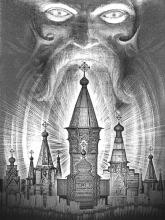 И старейший, Словен, с родом своим и со всеми, иже под рукою его, седе на реце, зовомей тогда Мутная, последи ж Волхов проименовася во имя старейшаго сына Словенова, Волхова зовома. Начало Словенску граду, иже последи Новъград Великий проименовася. И поставиша град, и именоваша его по имени князя своего Словенеск Великий, той же ныне Новъград, от устия великаго езера Илмеря вниз по велицей реце, проименованием Волхов, полтора поприща. И от того времени новопришельцы скифстии начаху именоватися словяне, и реку некую, во Илмер впадшую, прозваша во имя жены Словеновы Шелони. Во имя же меньшаго сына Словенова Волховца преименова оборотню протоку, иж течет из великие реки Волхова и паки обращается в него. Больший же сын оного князя Словена Волхв бесоугодник и чародей и лют в людех тогда бысть, и бесовскими ухищреньми мечты творя многи, и преобразуяся во образ лютаго зверя коркодила, и залегаше в той реце Волхове путь водный, и не поклоняющих же ся ему овых пожираше, овых же испроверзая и утопляя. Сего же ради людие, тогда невегласи, сущим богом окаяннаго того нарицая и Грома его, или Перуна, рекоша, руским бо языком гром перун именуется. Постави же он, окаянный чародей, нощных ради мечтаний и собирания бесовскаго градок мал на месте некоем, зовомо Перыня, иде же и кумир Перунов стояше. И баснословят о сем волхве невегласи, глаголюще, в боги сел окаяннаго претворяюще. Наше же християнское истинное слово с неложным испытанием многоиспытне извести о сем окаяннем чародеи и Волхове, яко зле разбиен бысть и удавлен от бесов в реце Волхове и мечтаньми бесовскими окаянное тело несено бысть вверх по оной реце Волхову и извержено на брег противу волховнаго его градка, иде же ныне зовется Перыня. И со многим плачем тут от неверных погребен бысть окаянный с великою тризною поганскою, и могилу ссыпаша над ним велми высоку, яко же обычай есть поганым. И по трех убо днех окаяннаго того тризнища проседеся земля и пожре мерзкое тело коркодилово, и могила его просыпася с ним купно во дно адово, иже и доныне, яко ж поведают, знак ямы тоя не наполнися. Другий же сын Словенов малый Волховец живяше со отцем своим во граде своем великом Словенцы. И родися Волховцу сын Жилотуг, и протока проименовася во имя его Жилотуг, в ней же той утопе еще детеск.