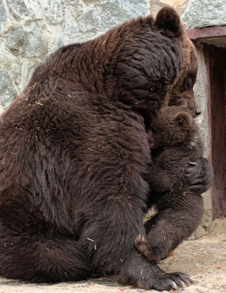 Эти фото были сняты в зоопарке Симферополя. Мама-медведица, разозлившись на своего отпрыска, загнала его в угол, затем схватила малыша за шею и стала трясти его. После воспитательных процедур, 240-килограммовый хищник скромно обнял своего отпрыска.