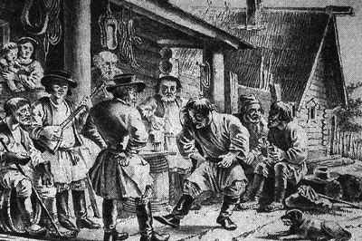 Дети-шалуны, которым уже надоела какая-либо игра, бросаются друг на друга, толкают, кричат, бегают, падают, ушибаются — этого мало, этого им не довольно: они ищут других ощущений. Кто порезвее, тот призывает к новой забаве — теребить нос. Становятся друг против друга и кричат. «Начинай».— «Нет, ты начинай». Тут один начинает спрашивать, а другой отвечает ему: «Чей нос?» — «Савин».— «Где был?» — «Славил».— «Что выславил?» — «Копейку».— «Куда дел?» — «Пряник купил».— «С кем съел?» — «Один». При этом слове спрашивавший хватает за нос своего противника, подергивает во все стороны, приговаривая: «Не ешь один, не ешь один». Если другой шалун скажет тогда, что съест с ним, то нос его оставляют в покое. Случается, что неотвязчивые шалуны до того наклеивают носы, что долго, долго помнят их. И кто забывает носы? Многие водят за носы, а многие натягивают их так длинно — что ваш немецкий!