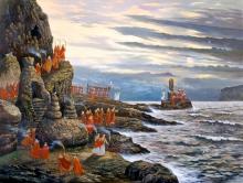 Среди больших строений на площади высился храм Бога Свентовида. Но руяне были еще и морским народом. Богиня Ран олицетворяла силу и тайну моря. На картине виден вдающийся в море мыс, на котором высится каменный кумир, изображающий богиню. Жрецы несут священную ладью.