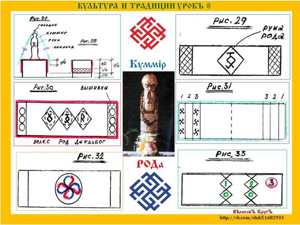 Дальше, (рис.29) – вот у вас рушник, с краю – вышивка, а в центре рушника либо ромб, либо круг, а в нем изображается руна Рода – если стоит Куммiръ Рода, значит, по основанию и должна быть изображена руна Рода. Если стоит Куммiръ Велеса, значит, там должна быть изображена руна Велеса. Т.е. самой руны вышитой ее не видно, т.к. Куммiръ ставится так, чтобы она была закрыта: эта руна у нас проявлена у нас вот здесь, т.е. она на самом Куммiре изображена. Но её подача энергии как бы тоже идет. Т.е. какого Куммiра мы ставим, под того такой символ и делается – либо круг, …