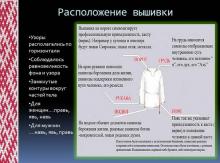 По мнению древних, следовало так или иначе «обезопасить» ee необходимые отверстия, имевшиеся в готовой одежде: ворот, подол, рукава. Оберегом здесь служила вышивка, содержавшая всевозможные священные изображения и магические символы. Языческий смысл народных вышивок очень хорошо прослеживается с древнейших образцов до вполне современных работ, недаром учёные считают вышивку важным источником в изучении древней религии. Эта тема поистине необъятна, ей посвящено огромное количество научных трудов Славянские рубахи не имели отложных воротников. Иногда удаётся восстановить нечто похожее на современную «стоечку». Чаще всего разрез у ворота делали прямым — посередине груди, но бывал и косой, справа или слева.