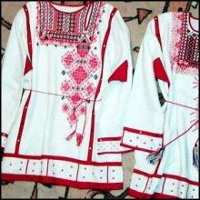 Вышивка выполнялась, в основном, нитками красного цвета и всех его оттенков: алого, брусничного, смородинового, макового, вишнёвого. Этому цвету придавалось особое значение. Швы, которыми выполнялась вышивка – счётные. То есть для каждого стежка считаются нити ткани! Рисунок на ткань предварительно не переводился, а лишь крупными стежками намечалось его место и размер.