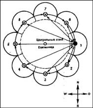 Но как же практически велся счет дней в святилищах такого типа? Поскольку один — восточный костер горел постоянно, день, когда все остальные огни были погашены, считался первым (см. схему 1, положение 1—1). На второй день зажигался следующий по ходу Солнца костер, а первый продолжал гореть (положение 1—2), подобное чередование длилось в течение восьми дней (до положения 1— 8). На девятый день зажигались все восемь костров сразу, что символически означало и жертвенное «всесожжение» небу и само «сияющее небо» — «диво» славян или deiuo индоевропейцев.