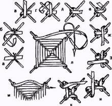 Принцип плетения всех фигур одинаков, поэтому достаточно освоить приемы плетения наиболее простой из них - квадрата (рис. 9). Начинают плести с изготовления каркаса (а). Две соломины (палочки) располагают под прямым углом друг к другу и прочно связывают. Одновременно к крестовине привязывают ленту из соломы. Затем ею последовательно обвивают стойки крестовины, получая таким образом первую спираль квадрата (б - к). Так же